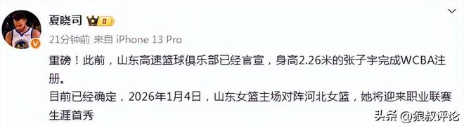 北京时间12月29日,根据山东媒体人“夏晓司”报道,山东高速篮球俱乐部已经官宣,身高2.26米的张子宇完成WCBA注册。